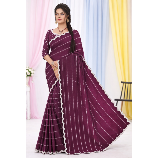 This saree features a deep plum purple base with fine white vertical stripes for a subtle striped texture, accented by delicate white lace scalloped borders along the edges, pallu, and matching full-sleeve blouse.