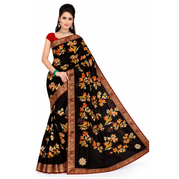 This black saree stands out with its rich black base adorned by vibrant orange-yellow floral prints scattered across the fabric.