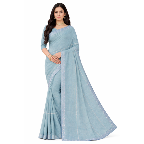 This saree is a elegant light sky blue plain design, likely in soft premium fabric, offering a subtle sheen and comfortable drape for everyday elegance. It stands out with intricate white zari embroidery along the border and pallu, featuring chain-like motifs, sequins, and delicate scalloped edges for a touch of sophistication