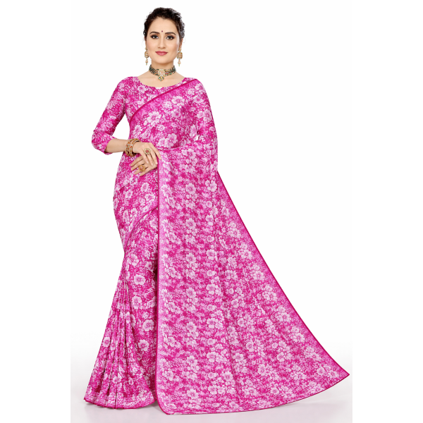 This saree is a vibrant magenta pink printed all-over with large white floral blooms, creating a fresh, summery ethnic look with plain pink borders for clean definition