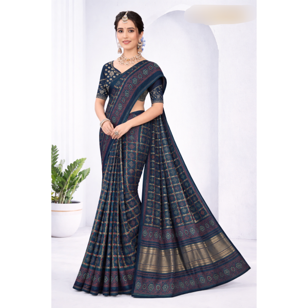 This saree features a deep navy blue base with an all-over checkered ajrakh block-print pattern in subtle red, gold, and black tones, framed by intricate multicolored zari borders on the pallu and hem The geometric ajrakh checks evoke traditional Sindhi craftsmanship, with metallic gold piping enhancing the borders for a rich, textured silk