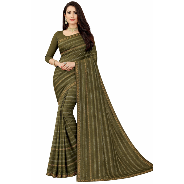 This saree showcases an olive green premium fabric with fine vertical gold zari stripes running across the body, creating a subtle textured sheen. The standout feature is the intricate gold zari embroidered border along the pallu and edges, adorned with woven motifs for a luxurious finish