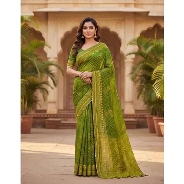 This stunning green Bandhani-inspired saree, its luxurious premium fabric that drapes elegantly. The vibrant mint green base features intricate geometric jaal patterns in subtle golden-yellow tones, creating a fresh, summery vibe perfect for festive or wedding occasions.